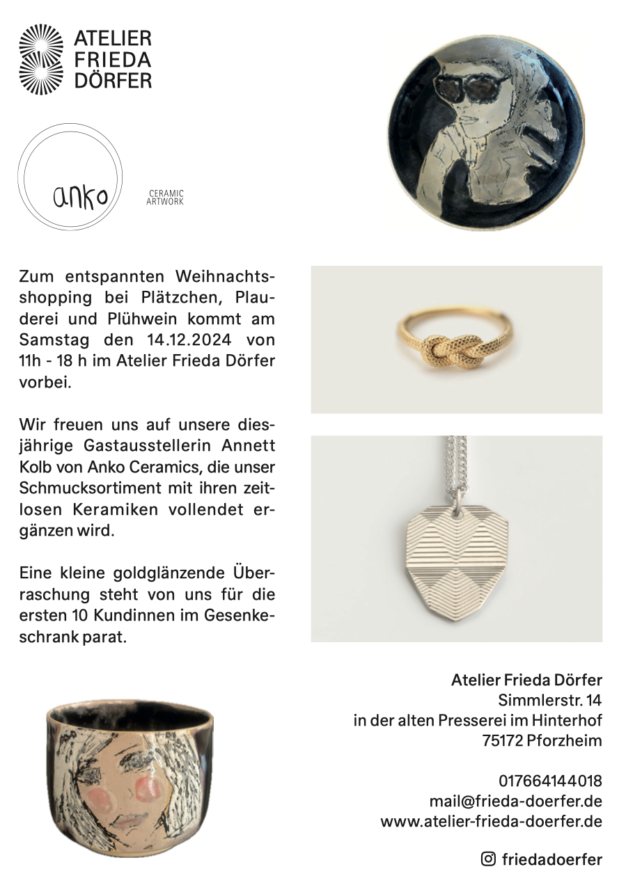 Verkaufsausstellung am 14.12.2024 von 11 bis 18 Uhr im Atelier Frieda Dörfer